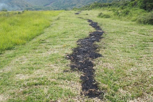 「輪地焼き」は、輪地切りで刈った草を焼くことで野焼き(本焼き)の際の延焼を防ぐ防火帯を完成させる作業です。