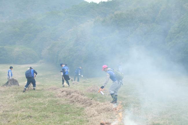 参加者は5班に分かれて、刈った草を熊手等で集めて畝を作ります。畝が完成すると、各班のリーダー・サブリーダーが火を入れ、他のメンバーは火が燃え広がらないよう火消し棒やジェットシューターで火を消していきます。