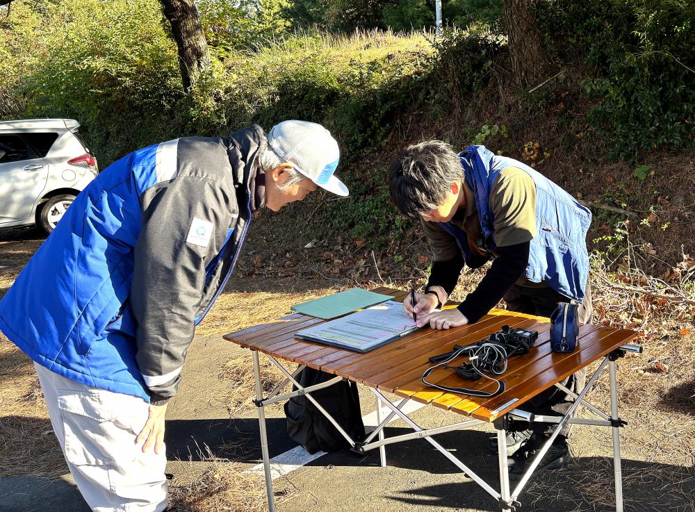 参加者の皆さまは、白木峰高原の駐車場に集合し、諫早市の公用バスにて森の駐車場まで移動していただきました