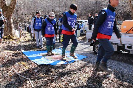 他の参加者は、火が防火帯の外へ広がらないよう、水嚢(ジェットシューター)による散水や火消棒を用いた消火作業を担当します