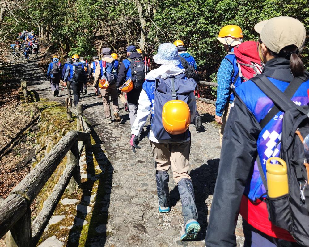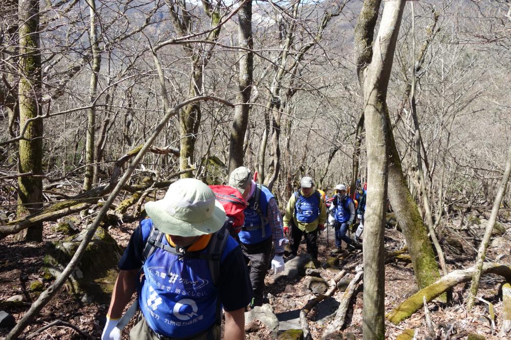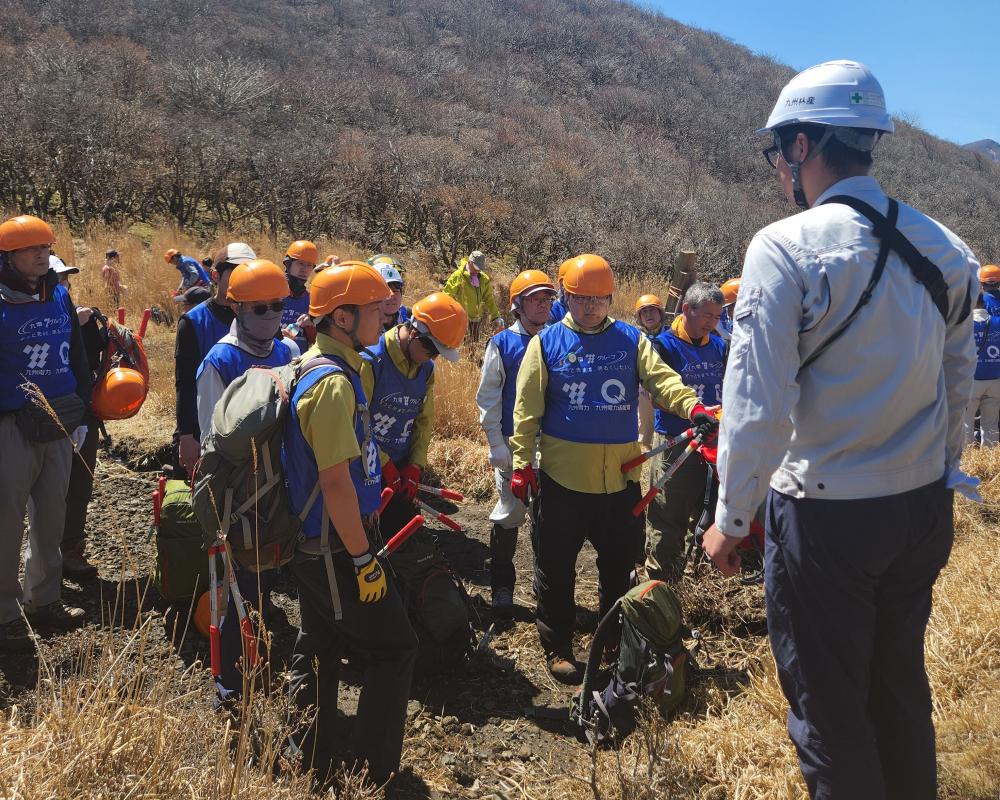 4月11日(土)に実施した今回の活動では、環境省、地域の自治体や団体等で構成する「平治岳の自然を考える会」メンバーや九電グループの従業員とその家族など100名の皆さまにご参加いただき、ミヤマキリシマの生育の支障となっている樹木の伐採や、登山道の整備を行いました。