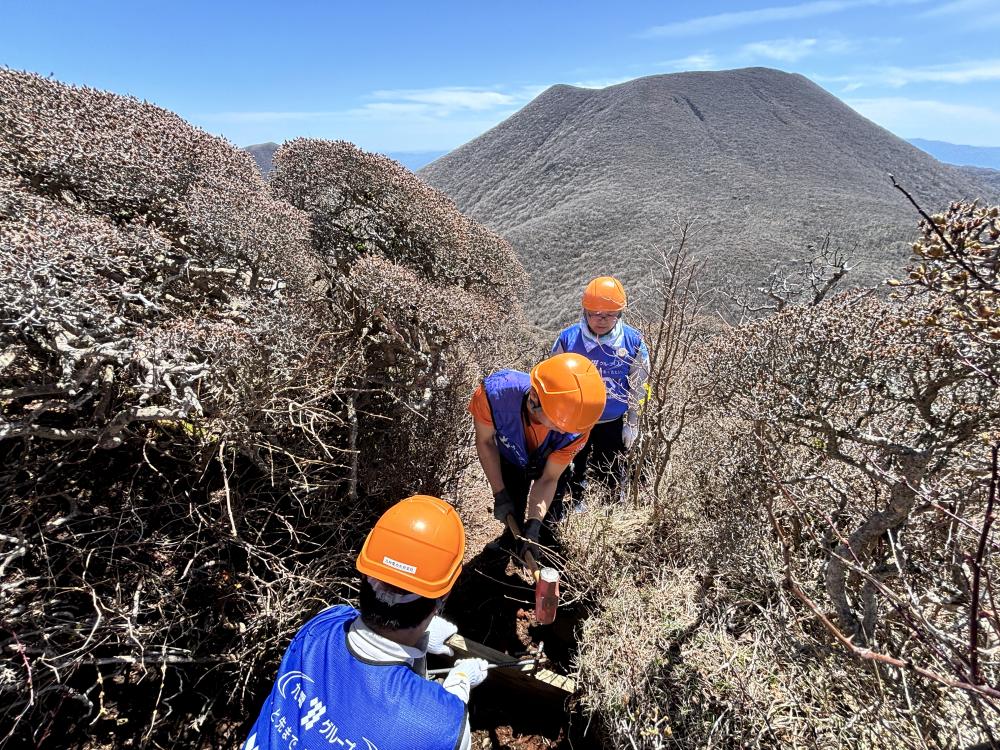 この希少で美しいミヤマキリシマを守るため、九電みらい財団では、地域の皆さまとともに生育の支障となる木を伐採する植生保護と登山道の崩落を防ぐ水切り板の整備活動を行っています。