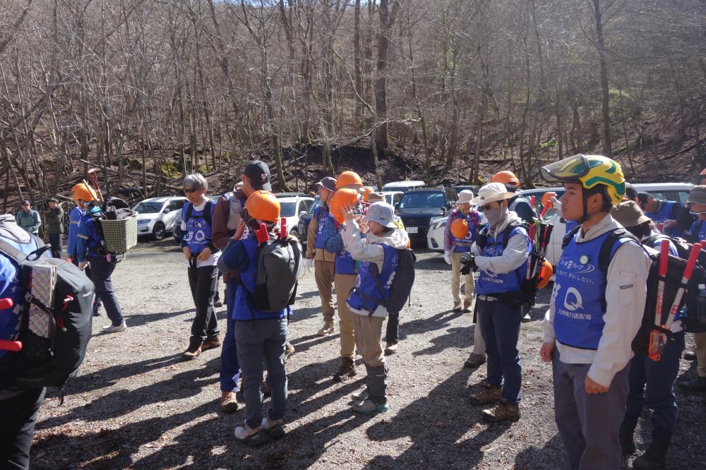 参加者の皆さまは、大船林道終点駐車場にて支障木伐採班と登山道整備班に分かれて、各々で資機材を受取ります