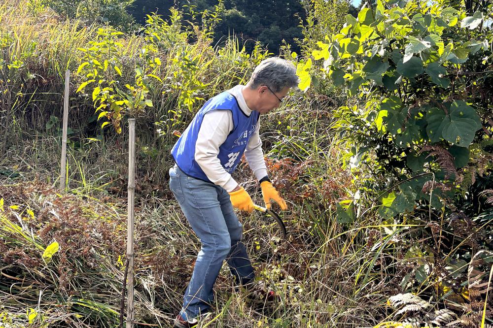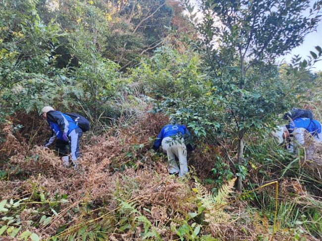 当日は、朝方冷えこみましたが活動時は気温も上がり作業に適した環境下で、参加者の皆さまは、草刈鎌やはさみを使い森や園路および階段の除草に取