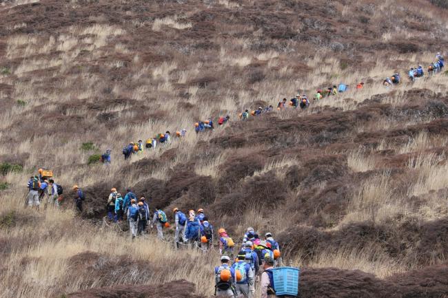 当日ご参加いただいたのは、環境省や地域の団体等で構成する「平治岳の自然を考える会」メンバーや九州電力グループの社員とその家族によるボランティアなど、約100名の方々。今回は登山の引率として「くじゅうネイチャーガイドクラブ」の方々にご協力いただきました(ありがとうございます!)
