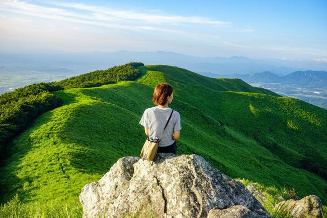 波の様に重なり合った丘の稜線とその先に見える阿蘇。